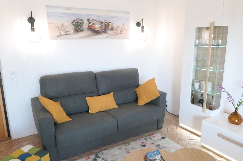 Télévision, wifi, canapé lit confortable et coin lecture donnant sur la terrasse vue mer et piscine.